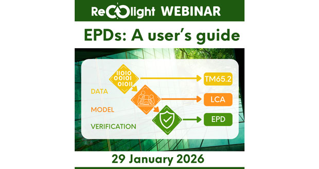 The webinar on 29 January will demystify Environmental Product Declarations (EPDs), addressing what they do and don’t reveal about luminaires. Participants will learn how to interpret EPD documentation and understand what constitutes robust, actionable data for comparing products. The expert panel features Max Robson, Environmental Metrics Manager at Recolight; Kael Gillam, Senior Associate at Hoare Lea; and Teresa Kleber, Portfolio Programme Manager at Ledvance’