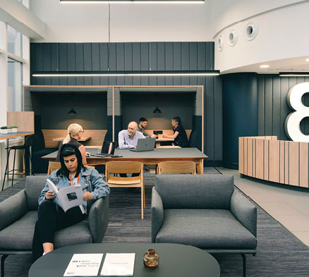 Central to this vision was to elevate the look and feel of the interiors with an initial series of projects for Jasper Sanders’ studio to upgrade the reception areas for Buildings 8 and 5. This included the creation of “third space” areas, including breakout booths, coffee break spaces and meeting areas for occupants.
